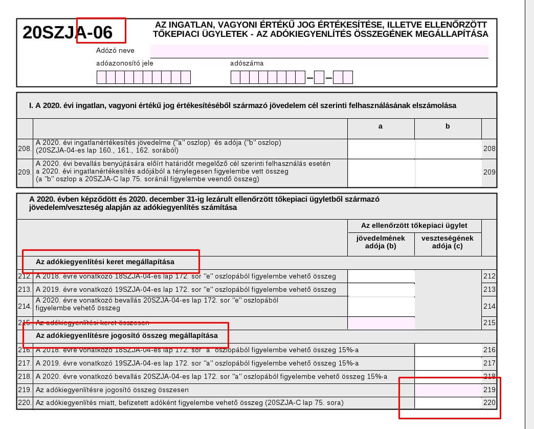 Az SZJA bevallás 06-os lapján kell kitölteni az adókiegyenlítéshez kapcsolódó részt. Adókiegyenlítési keret megállapítása (212–214. sorok)
